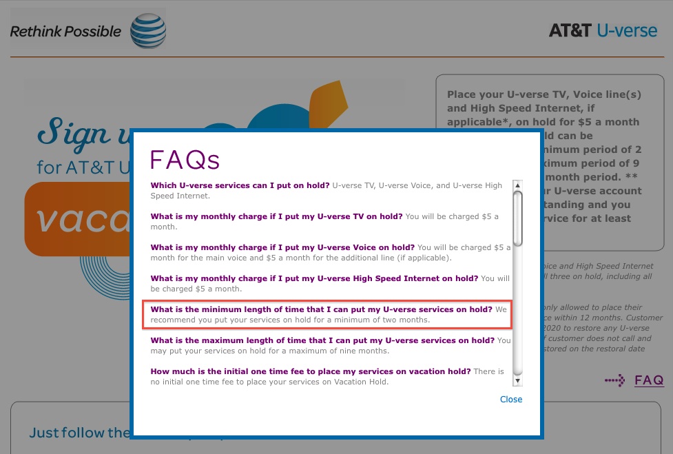 . The first is as I described for a 10 monthly fee they suspend service. This is more for snowbirds south in winter north in the summer or those receiving. You can request a vacation hold after your ATT service has been active for at least 30 days.